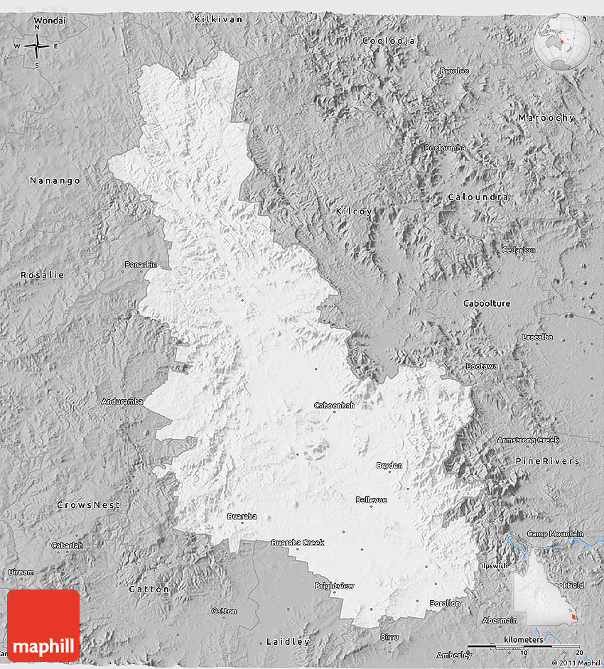 The 3D gray map represents one of several map types and styles available. Look at Esk, Queensland, Australia from different perspectives.