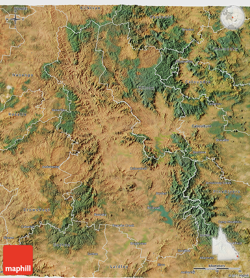 The 3D satellite map represents one of several map types and styles available. Look at Esk, Queensland, Australia from different perspectives.