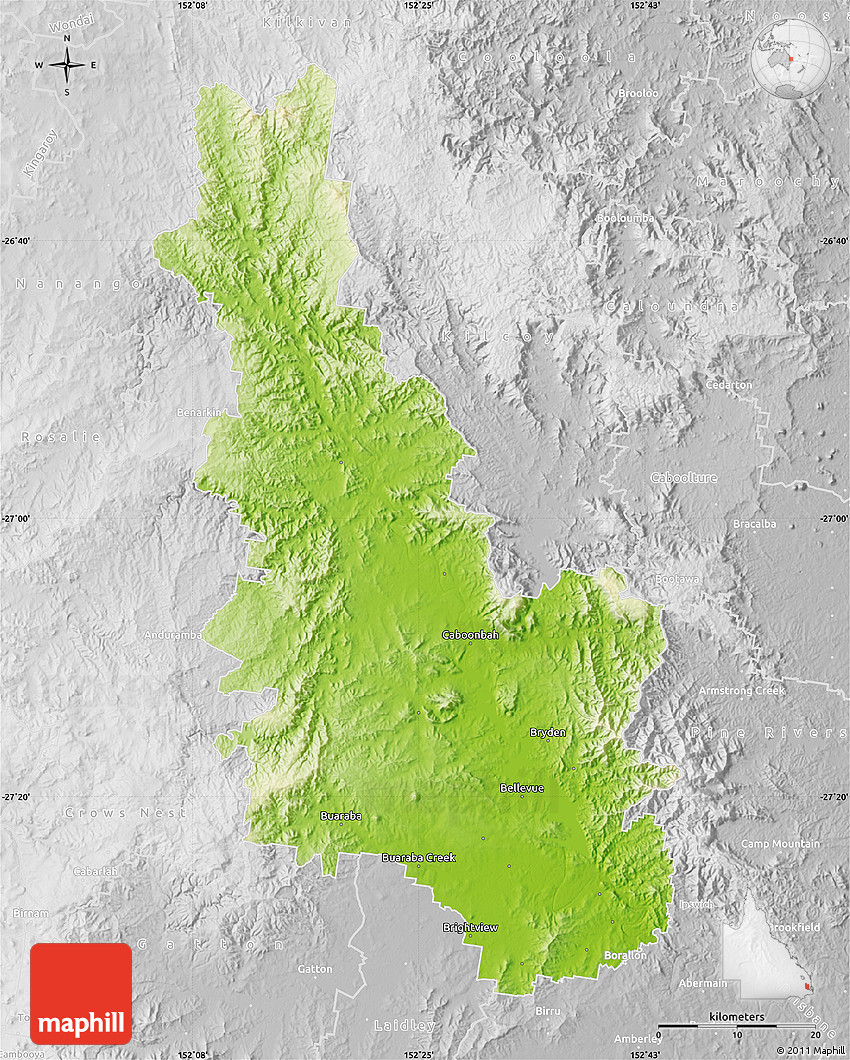 The flat physical map represents one of several map types and styles available. Look at Esk, Queensland, Australia from different perspectives.