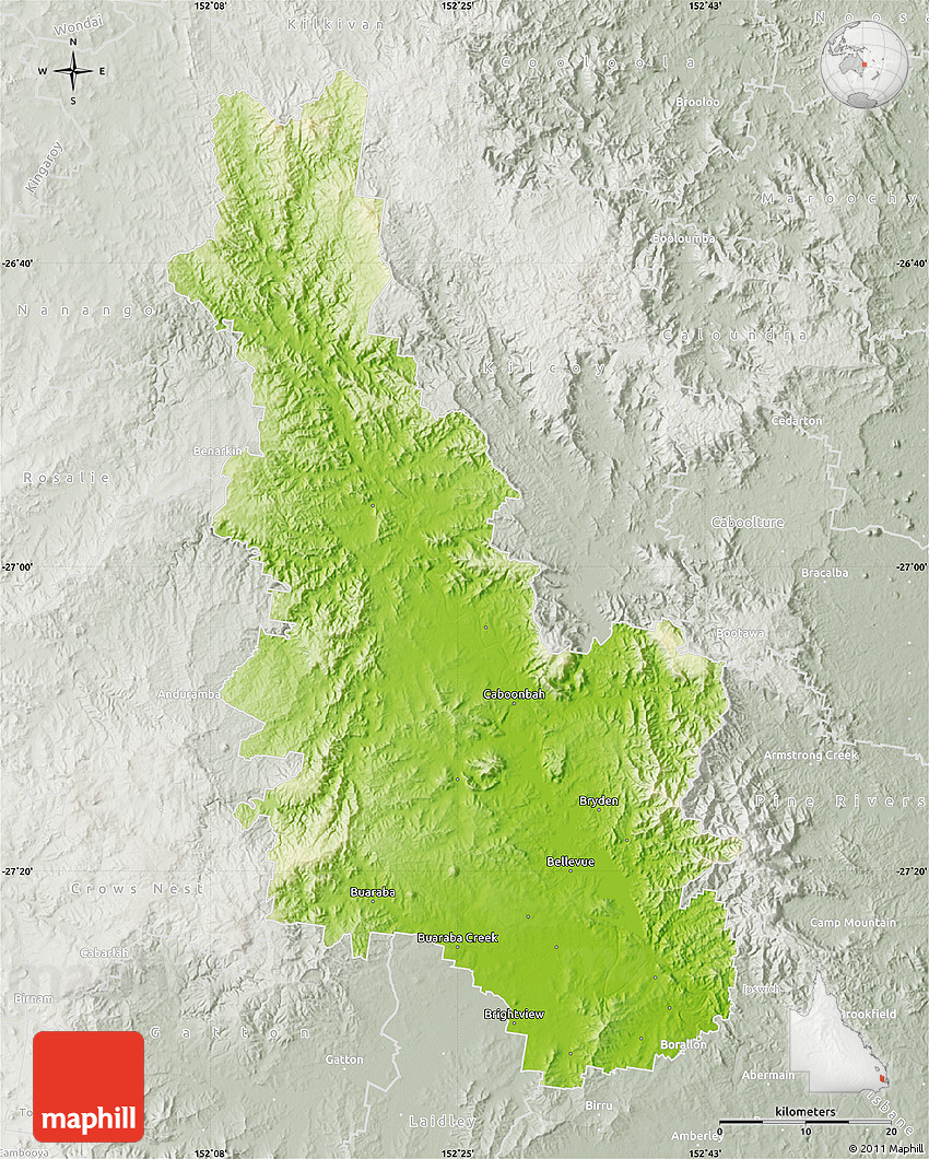 The flat physical map represents one of several map types and styles available. Look at Esk, Queensland, Australia from different perspectives.