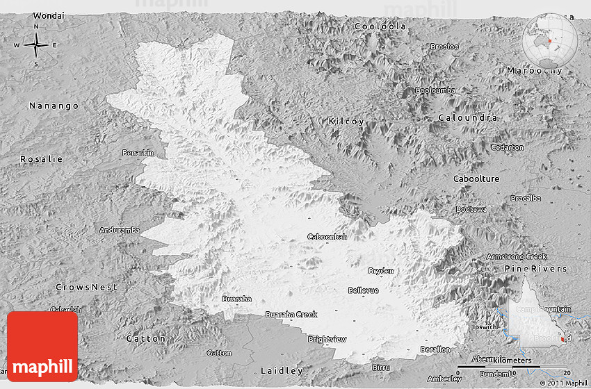 The panoramic gray map represents one of several map types and styles available. Look at Esk, Queensland, Australia from different perspectives.