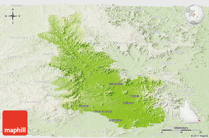 The panoramic physical map represents one of several map types and styles available. Look at Esk, Queensland, Australia from different perspectives.
