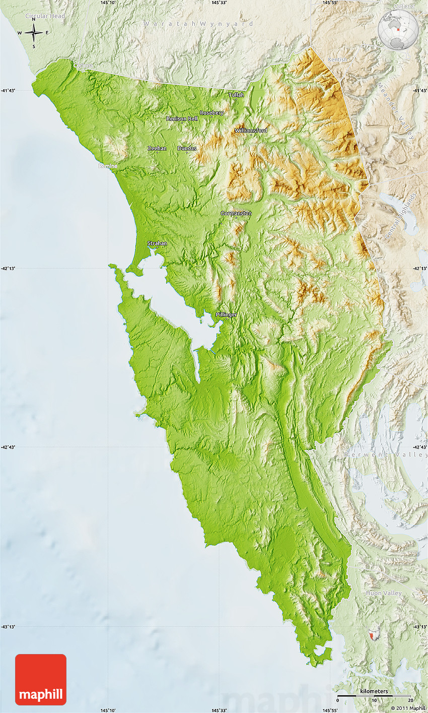 The flat physical map represents one of several map types and styles available. Look at West Coast, Tasmania, Australia from different perspectives.