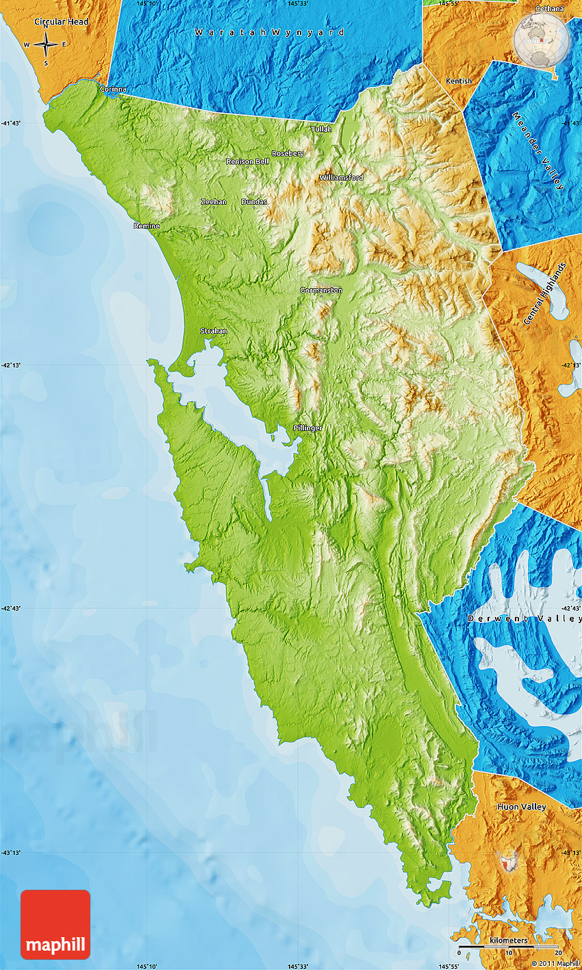 The flat physical map represents one of several map types and styles available. Look at West Coast, Tasmania, Australia from different perspectives.