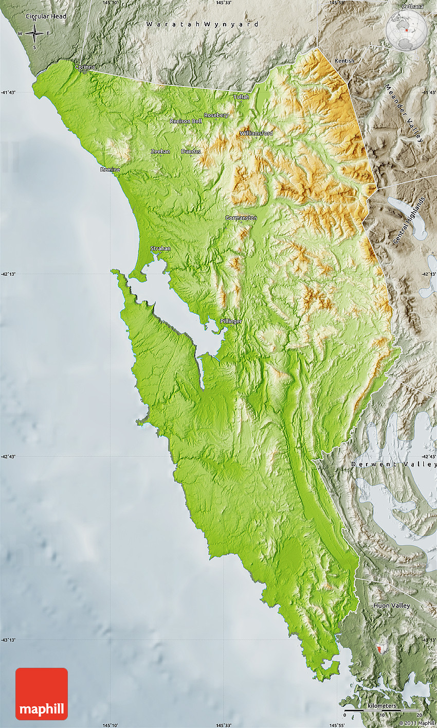 The flat physical map represents one of several map types and styles available. Look at West Coast, Tasmania, Australia from different perspectives.
