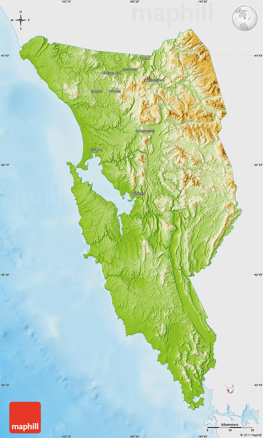 The flat physical map represents one of several map types and styles available. Look at West Coast, Tasmania, Australia from different perspectives.