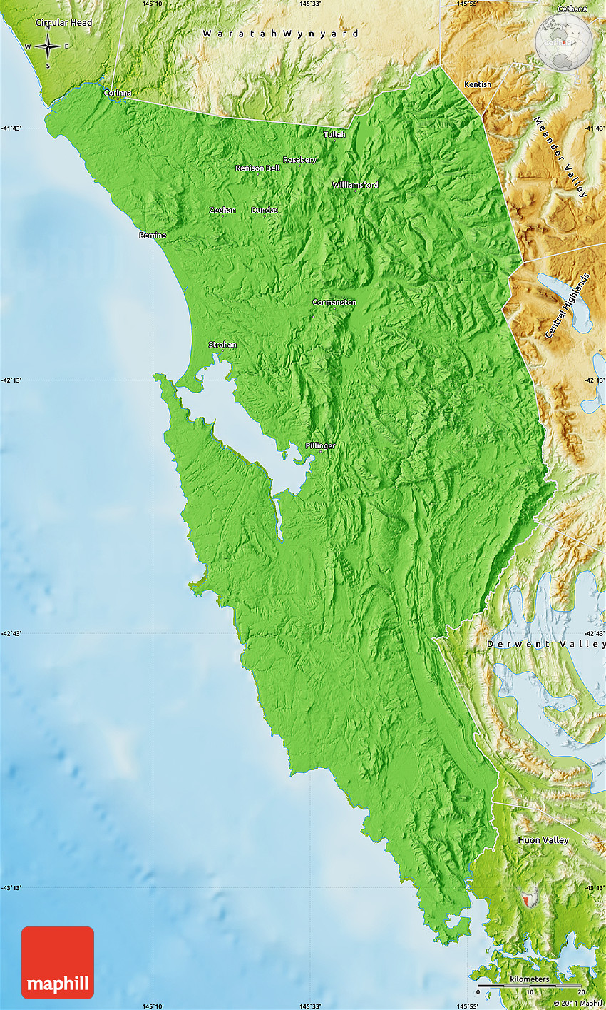 The flat political map represents one of several map types and styles available. Look at West Coast, Tasmania, Australia from different perspectives.