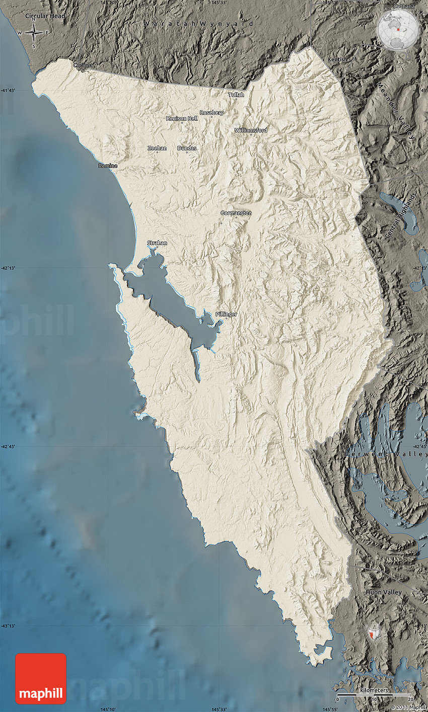 The flat shaded relief map represents one of several map types and styles available. Look at West Coast, Tasmania, Australia from different perspectives.