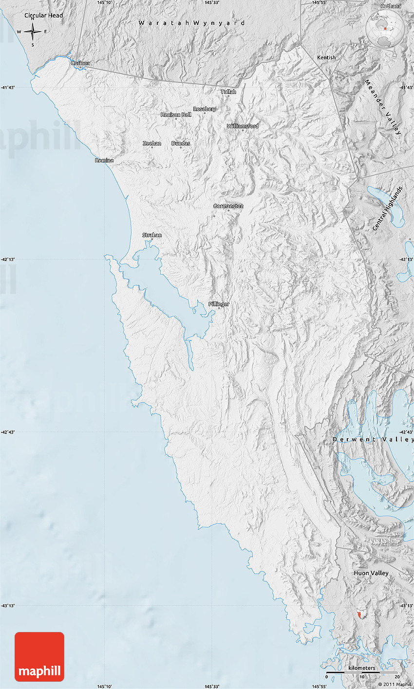 The flat silver style map represents one of several map types and styles available. Look at West Coast, Tasmania, Australia from different perspectives.