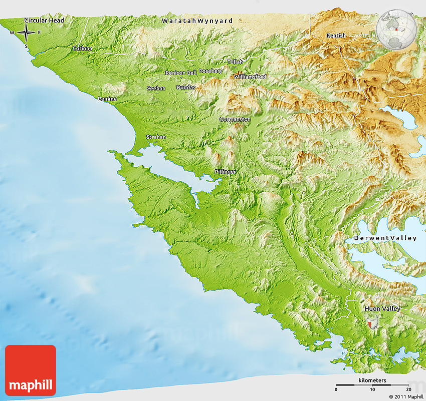The panoramic physical map represents one of several map types and styles available. Look at West Coast, Tasmania, Australia from different perspectives.