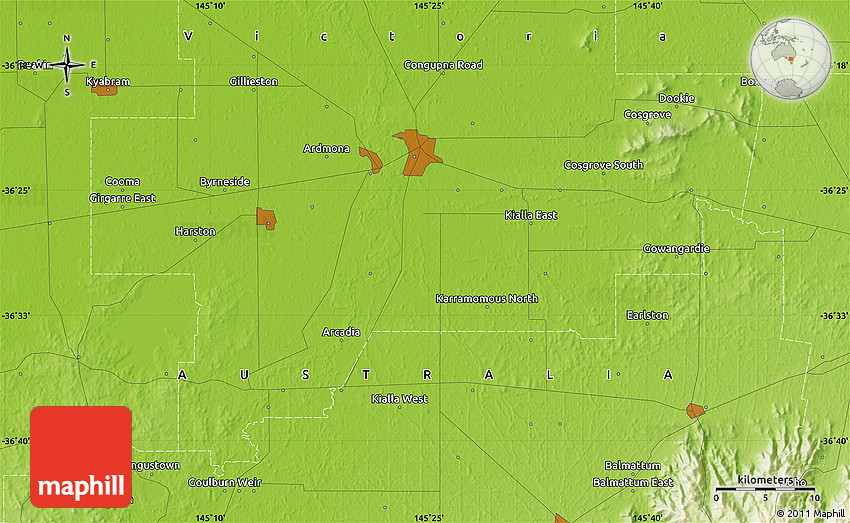 The flat physical map represents one of many map types available. Look at Cooma, Greater Shepparton, Victoria, Australia from different perspectives.