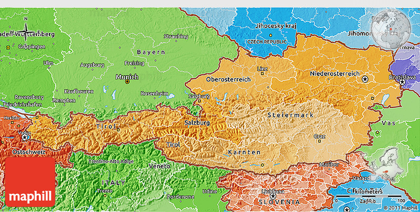 The 3D political shades map represents one of many map types and styles available. Look at Austria from different perspectives.