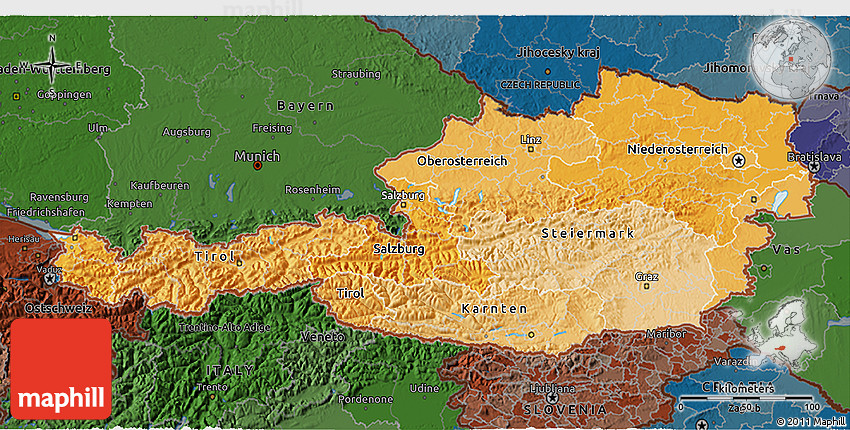The 3D political shades map represents one of many map types and styles available. Look at Austria from different perspectives.