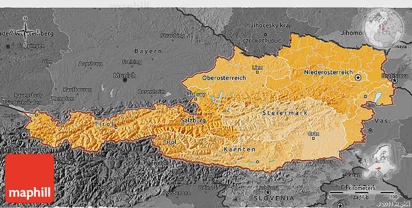 The 3D political shades map represents one of many map types and styles available. Look at Austria from different perspectives.