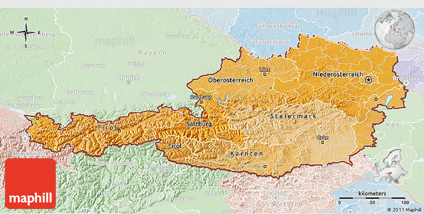 The 3D political shades map represents one of many map types and styles available. Look at Austria from different perspectives.