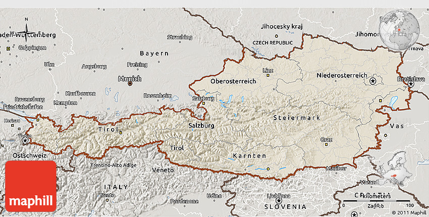 The value of Maphill lies in the possibility to look at the same area from several perspectives. Maphill presents the map of Austria in a wide variety of map types and styles.