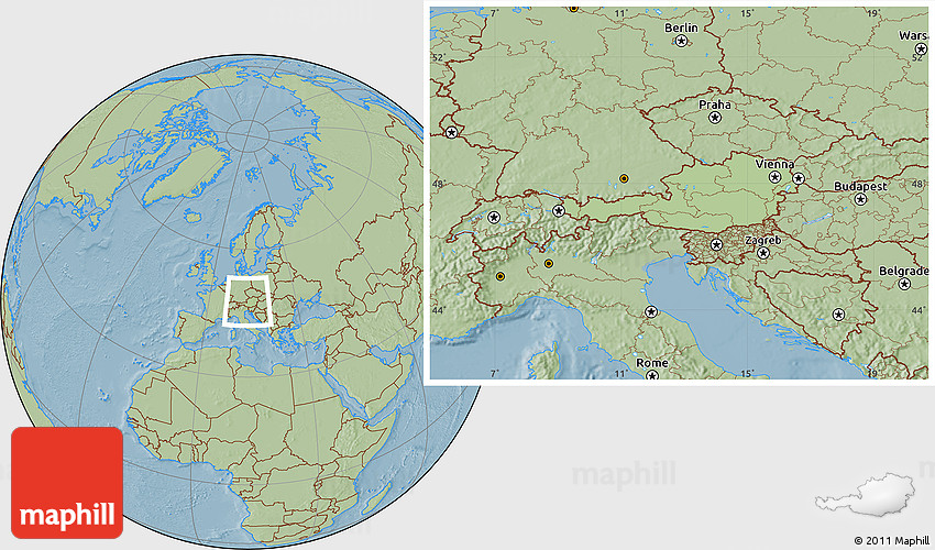 Maphill is a collection of map images. This image combines a savanna style map with the globe centered on Austria. Use the buttons under the image to switch to different map types.