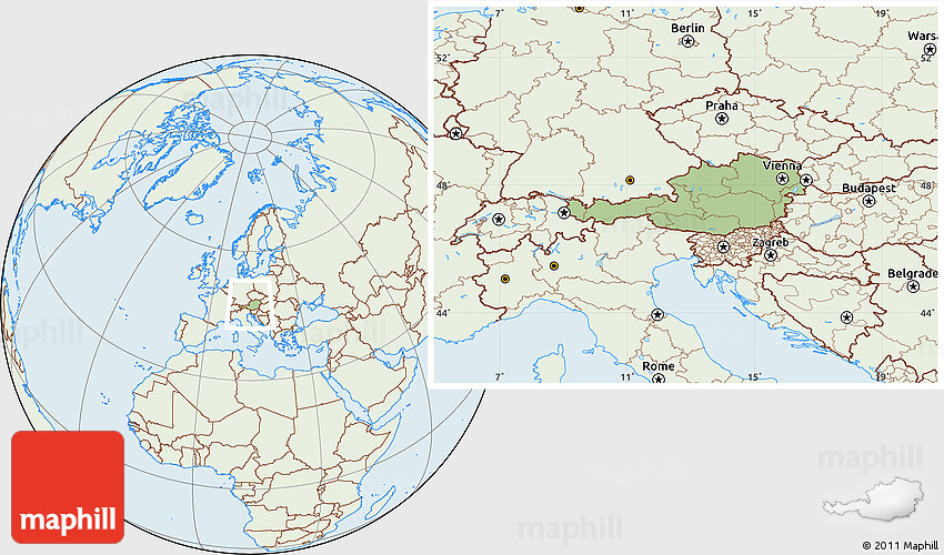 Maphill is a collection of map images. This image combines a savanna style map with the globe centered on Austria. Use the buttons under the image to switch to different map types.