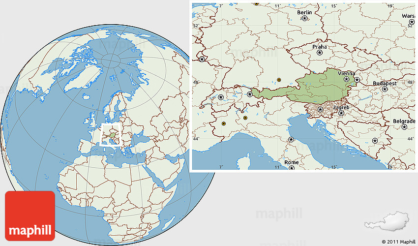 Maphill is a collection of map images. This image combines a savanna style map with the globe centered on Austria. Use the buttons under the image to switch to different map types.