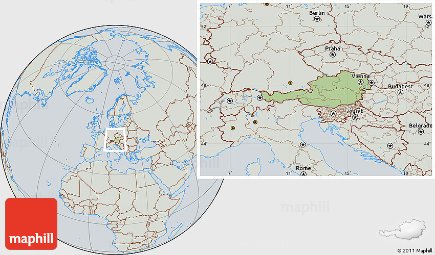 Maphill is a collection of map images. This image combines a savanna style map with the globe centered on Austria. Use the buttons under the image to switch to different map types.