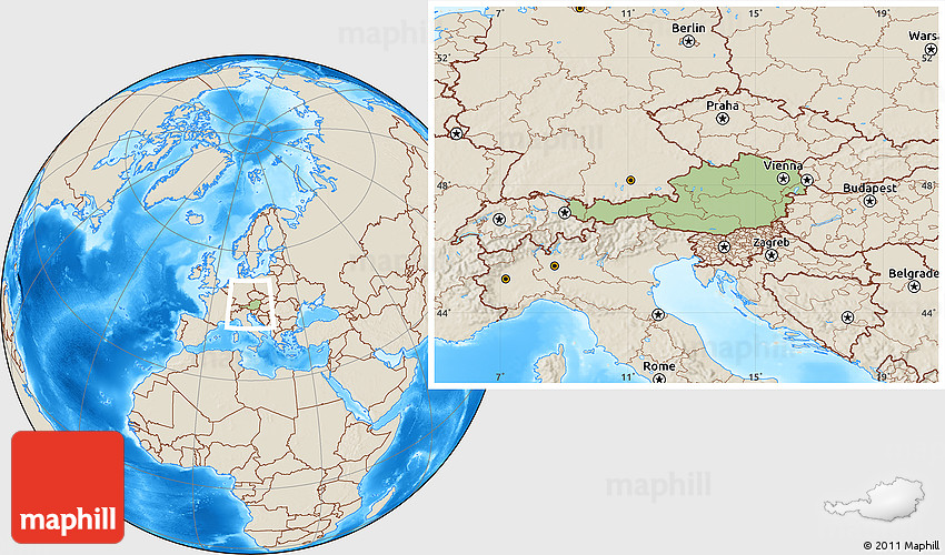 Maphill is a collection of map images. This image combines a savanna style map with the globe centered on Austria. Use the buttons under the image to switch to different map types.