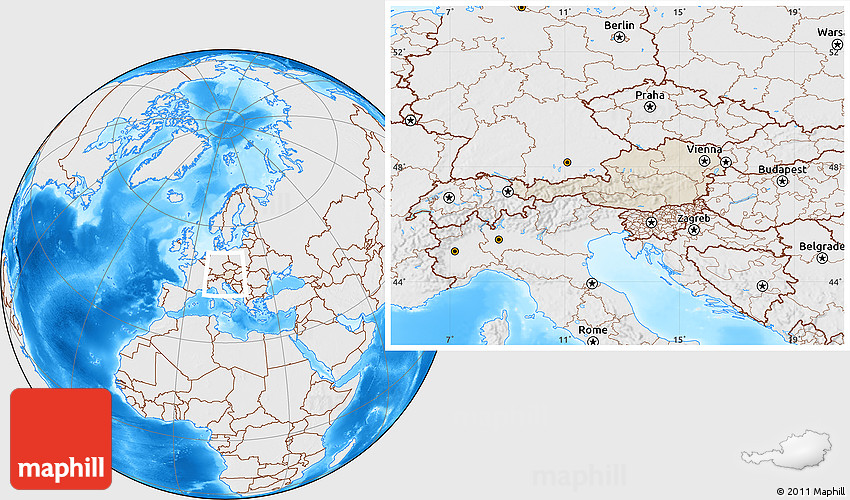 Maphill is a collection of map images. This image combines a shaded relief map with the globe centered on Austria. Use the buttons under the image to switch to different map types.