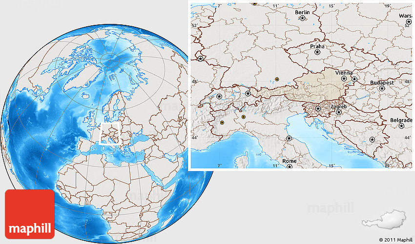 Maphill is a collection of map images. This image combines a shaded relief map with the globe centered on Austria. Use the buttons under the image to switch to different map types.