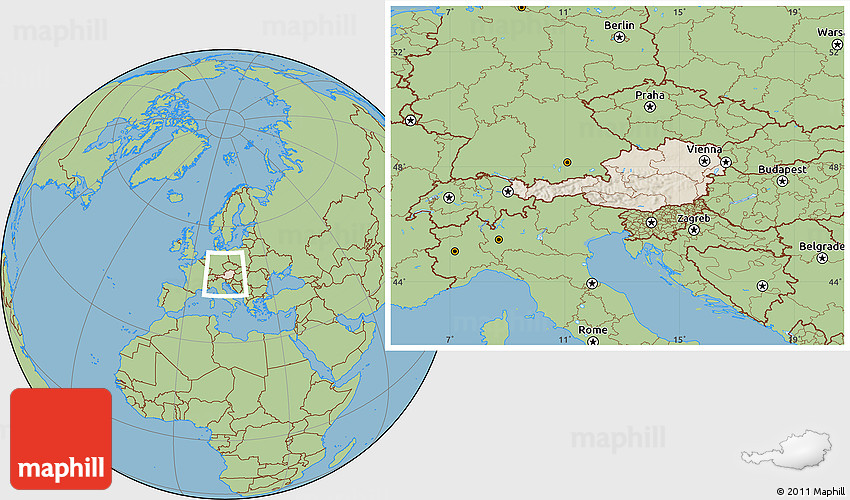 Maphill is a collection of map images. This image combines a shaded relief map with the globe centered on Austria. Use the buttons under the image to switch to different map types.