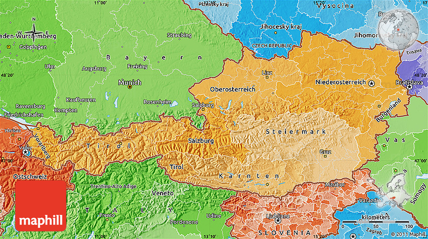 The value of Maphill lies in the possibility to look at the same area from several perspectives. Maphill presents the map of Austria in a wide variety of map types and styles.