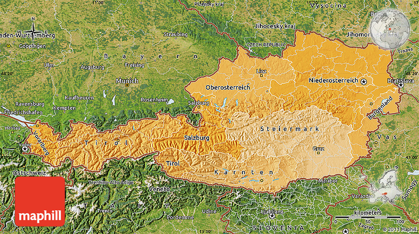 The value of Maphill lies in the possibility to look at the same area from several perspectives. Maphill presents the map of Austria in a wide variety of map types and styles.