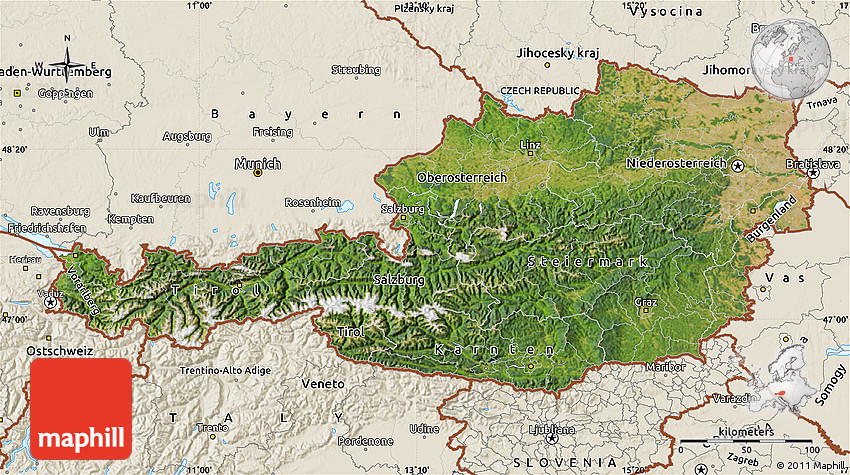 Each map type offers different information and each map style is designed for a different purpose. Read about the styles and map projection used in the above map (Satellite Map of Austria, shaded relief outside).