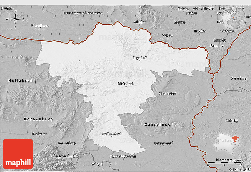 The grey colored map. Mistelbach is highlighted in white. This color scheme is similar to silver styled maps, but compared to the latter, a darker shade of gray is used.