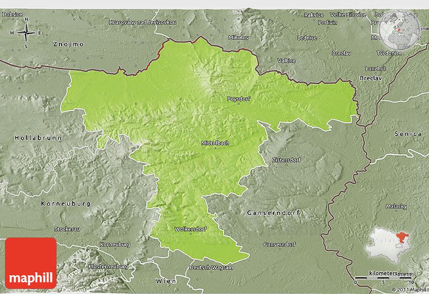 Physical map illustrates the mountains, lowlands, oceans, lakes and rivers and other physical landscape features of Mistelbach. Differences in land elevations relative to the sea level are represented by color.