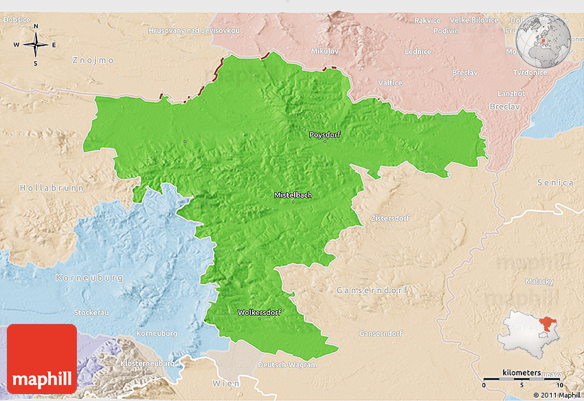 The 3D political map represents one of several map types and styles available. Look at Mistelbach, Niederösterreich, Austria from different perspectives.