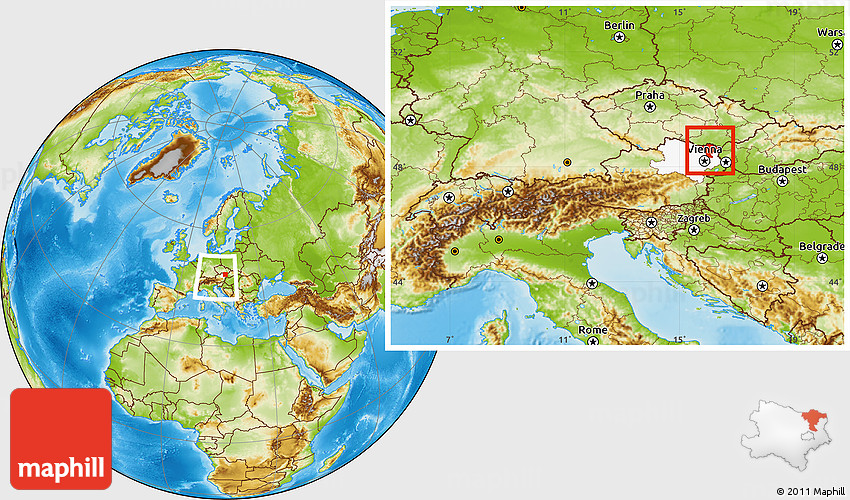 Maphill is a collection of map images. This image combines a physical map with the globe centered on Mistelbach. Use the buttons under the image to switch to different map types.