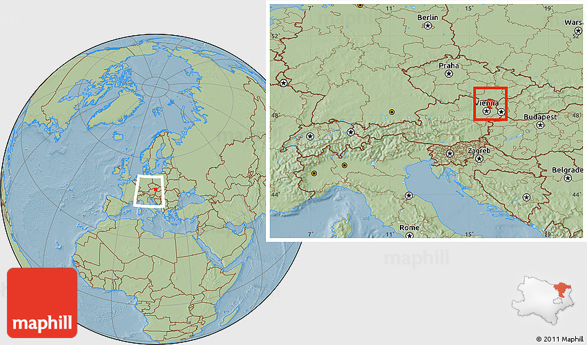 Each map type offers different information and each map style is designed for a different purpose. Read about the styles and map projection used in the above map (Savanna Style Location Map of Mistelbach, within the entire country, hill shading).