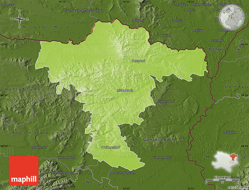 Physical map illustrates the mountains, lowlands, oceans, lakes and rivers and other physical landscape features of Mistelbach. Differences in land elevations relative to the sea level are represented by color.