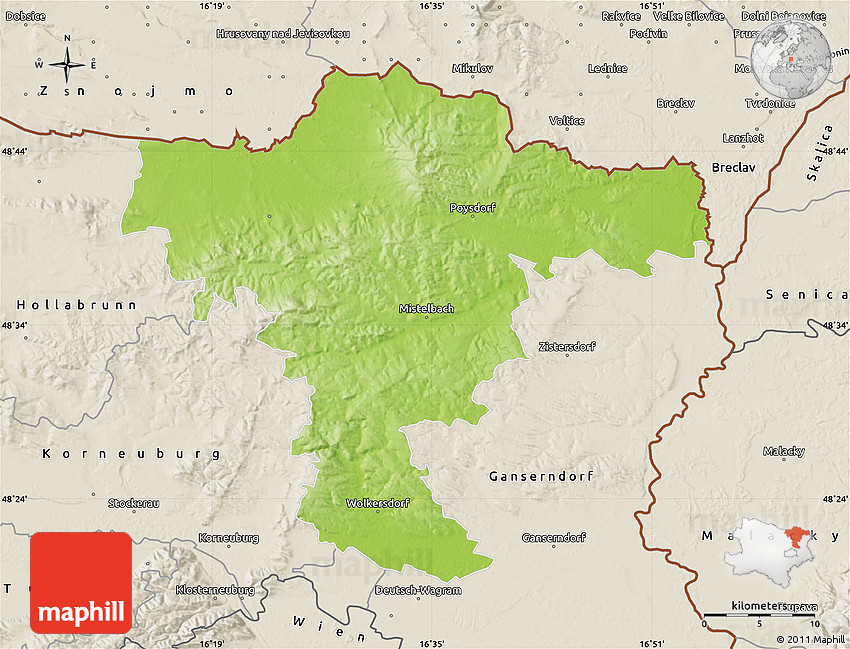 Physical map illustrates the mountains, lowlands, oceans, lakes and rivers and other physical landscape features of Mistelbach. Differences in land elevations relative to the sea level are represented by color.