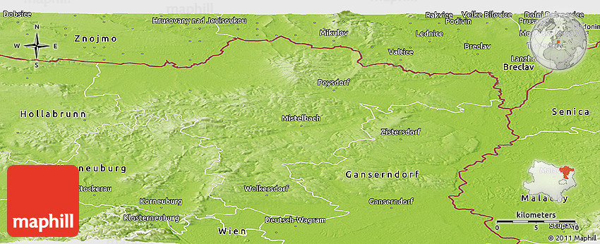 The panoramic physical map represents one of several map types and styles available. Look at Mistelbach, Niederösterreich, Austria from different perspectives.