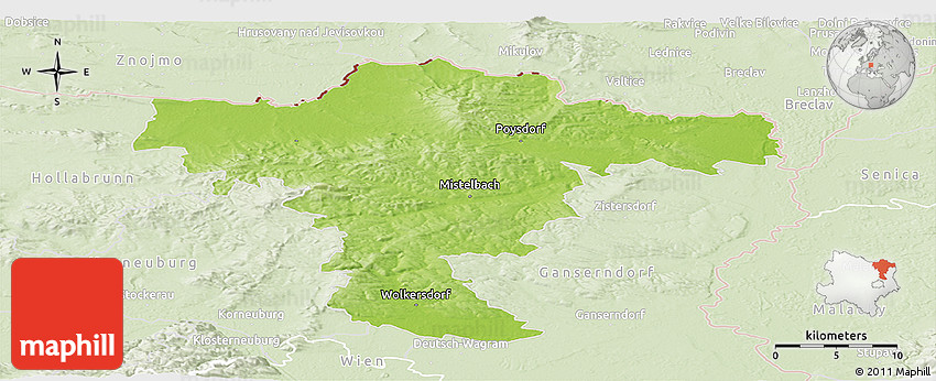 The panoramic physical map represents one of several map types and styles available. Look at Mistelbach, Niederösterreich, Austria from different perspectives.