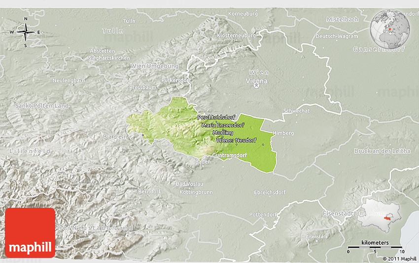 The 3D physical map represents one of several map types and styles available. Look at Modling, Niederösterreich, Austria from different perspectives.