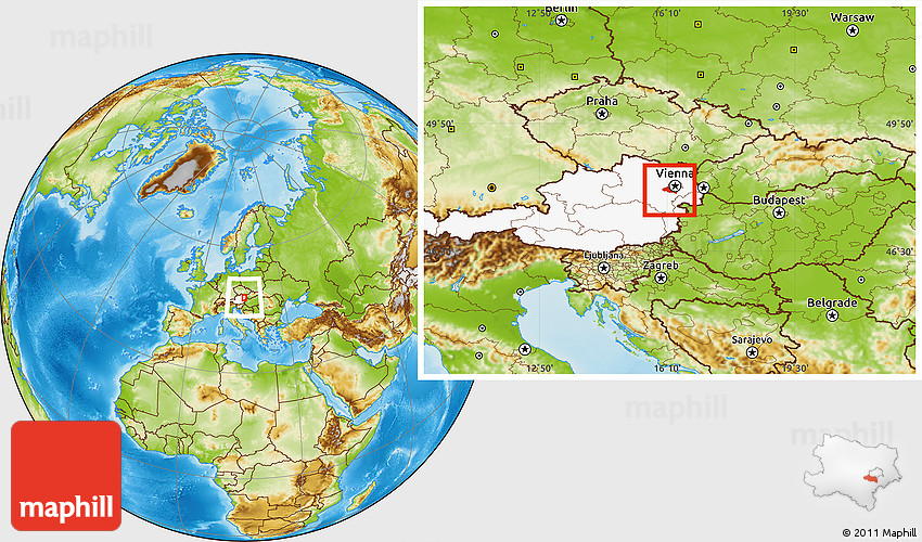 Maphill is a collection of map images. This image combines a physical map with the globe centered on Modling. Use the buttons under the image to switch to different map types.