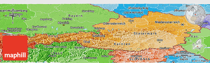 The value of Maphill lies in the possibility to look at the same area from several perspectives. Maphill presents the map of Austria in a wide variety of map types and styles.