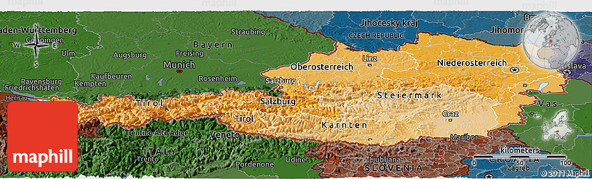 The panoramic political shades map represents one of many map types and styles available. Look at Austria from different perspectives.
