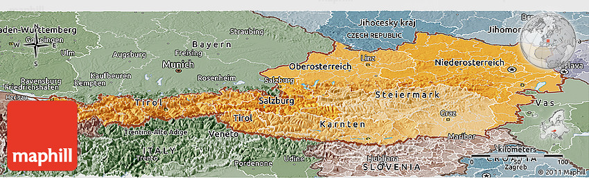 The panoramic political shades map represents one of many map types and styles available. Look at Austria from different perspectives.