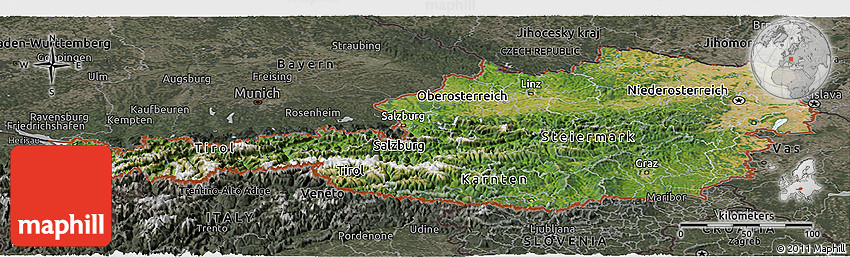 The panoramic satellite map represents one of many map types and styles available. Look at Austria from different perspectives.