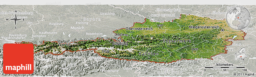 The panoramic satellite map represents one of many map types and styles available. Look at Austria from different perspectives.