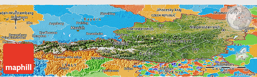 The value of Maphill lies in the possibility to look at the same area from several perspectives. Maphill presents the map of Austria in a wide variety of map types and styles.