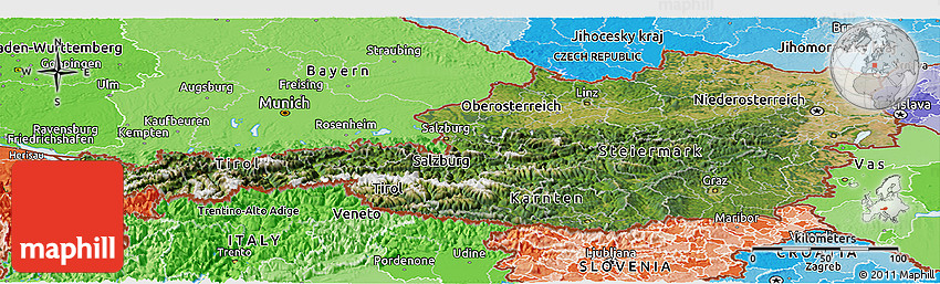 The value of Maphill lies in the possibility to look at the same area from several perspectives. Maphill presents the map of Austria in a wide variety of map types and styles.