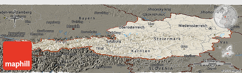 The value of Maphill lies in the possibility to look at the same area from several perspectives. Maphill presents the map of Austria in a wide variety of map types and styles.